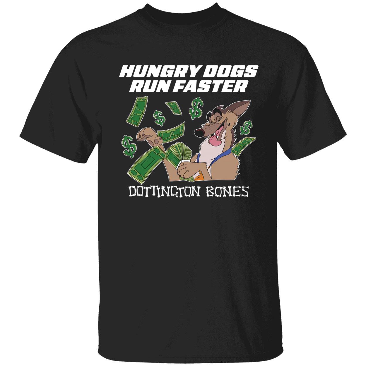 The T-shirt "Hungry Dogs Run Faster Dottington Bones T-Shirt" carries a message that is both practical and metaphorical, combined with a touch of humor and possibly related to a specific brand or story.